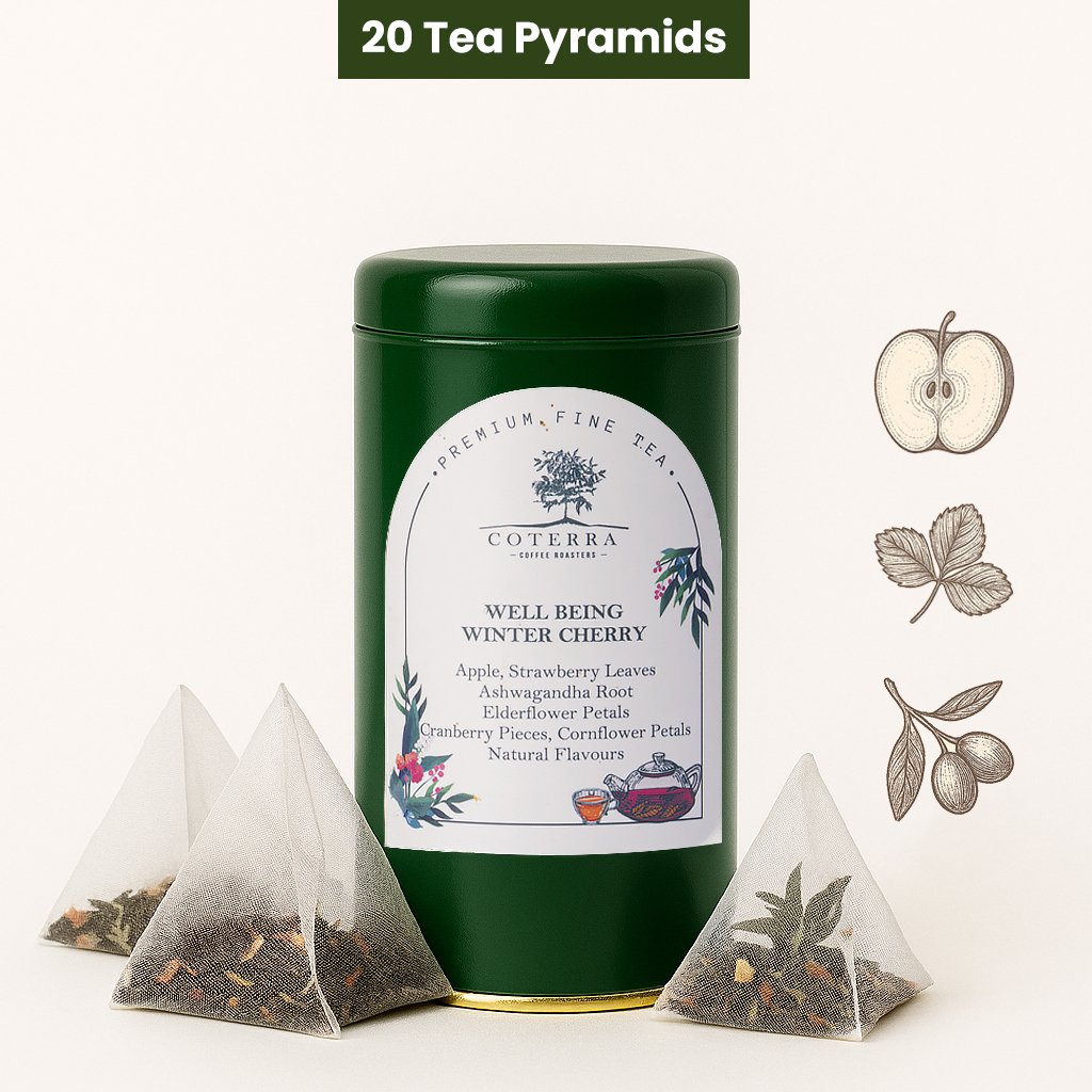 Apple , Strawberry leaves, Ashwagandha Root, Elderflower petals, Cranberry Pieces, Cornflower Petals Natural Flavours.